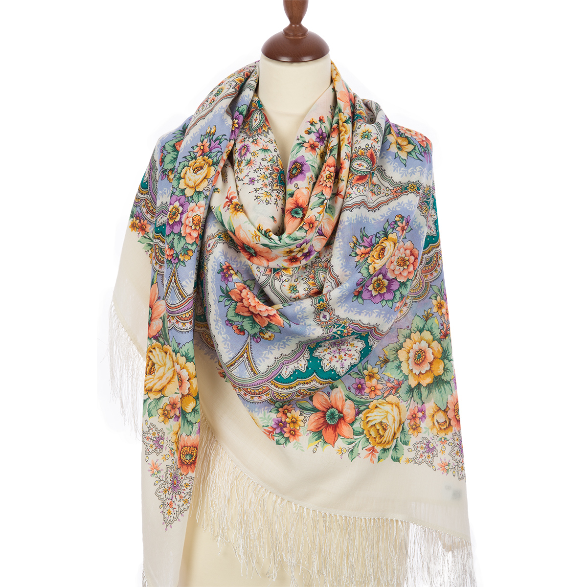 Платок шерстяной с шелковой бахромой "Снежинки и цветы", вид 1, 146x146 см