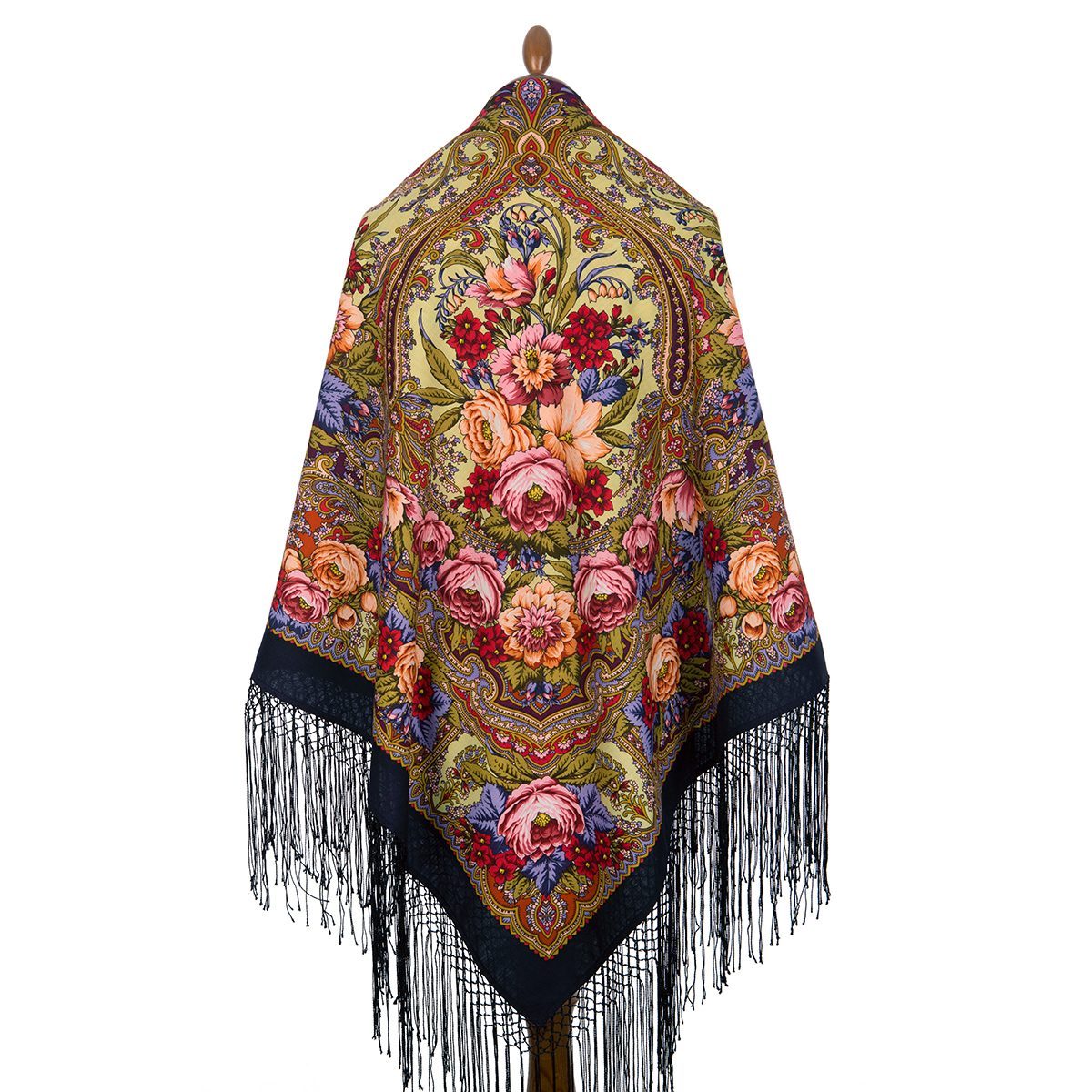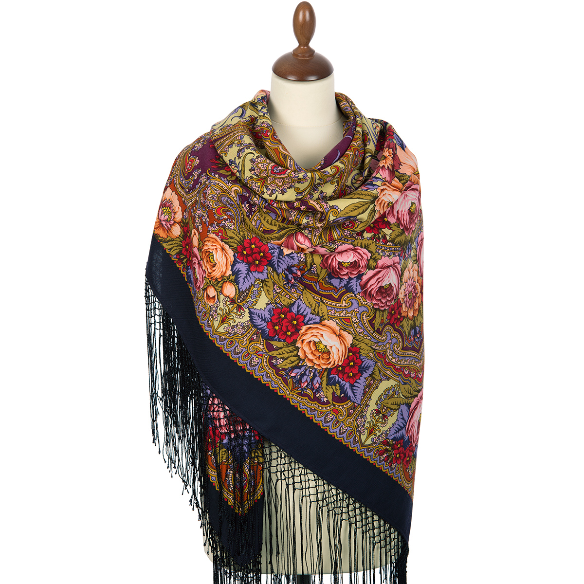 Многоцветный платок из уплотненной шерстяной ткани с шелковой бахромой "Счастливица", вид 16, 148х148см